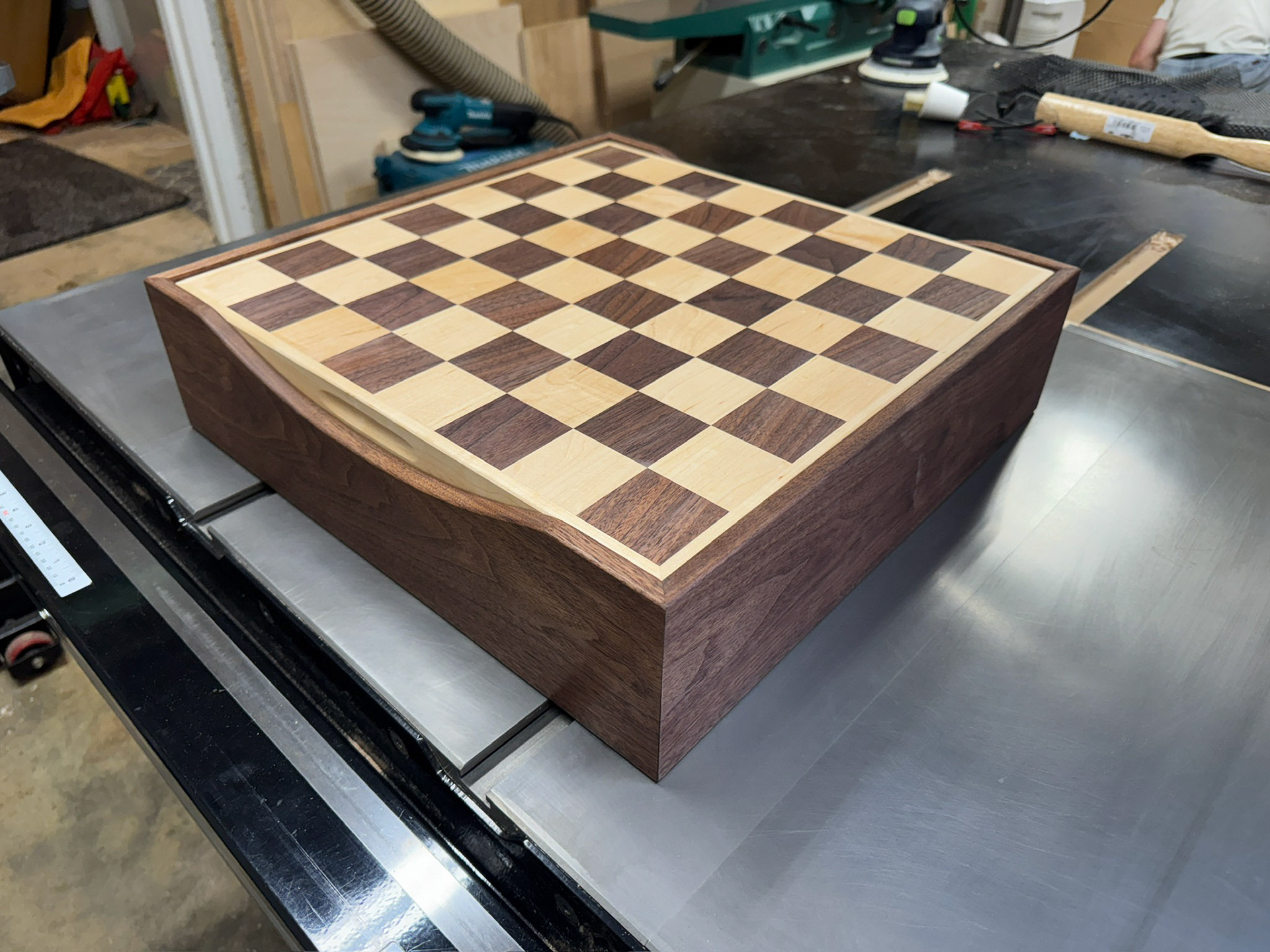 Chessboard box with internal storage for a deck of cards and chess pieces. Reversible board for chess and a decorative quadro-matched playing surface. The box is mitered and grain wrapped.