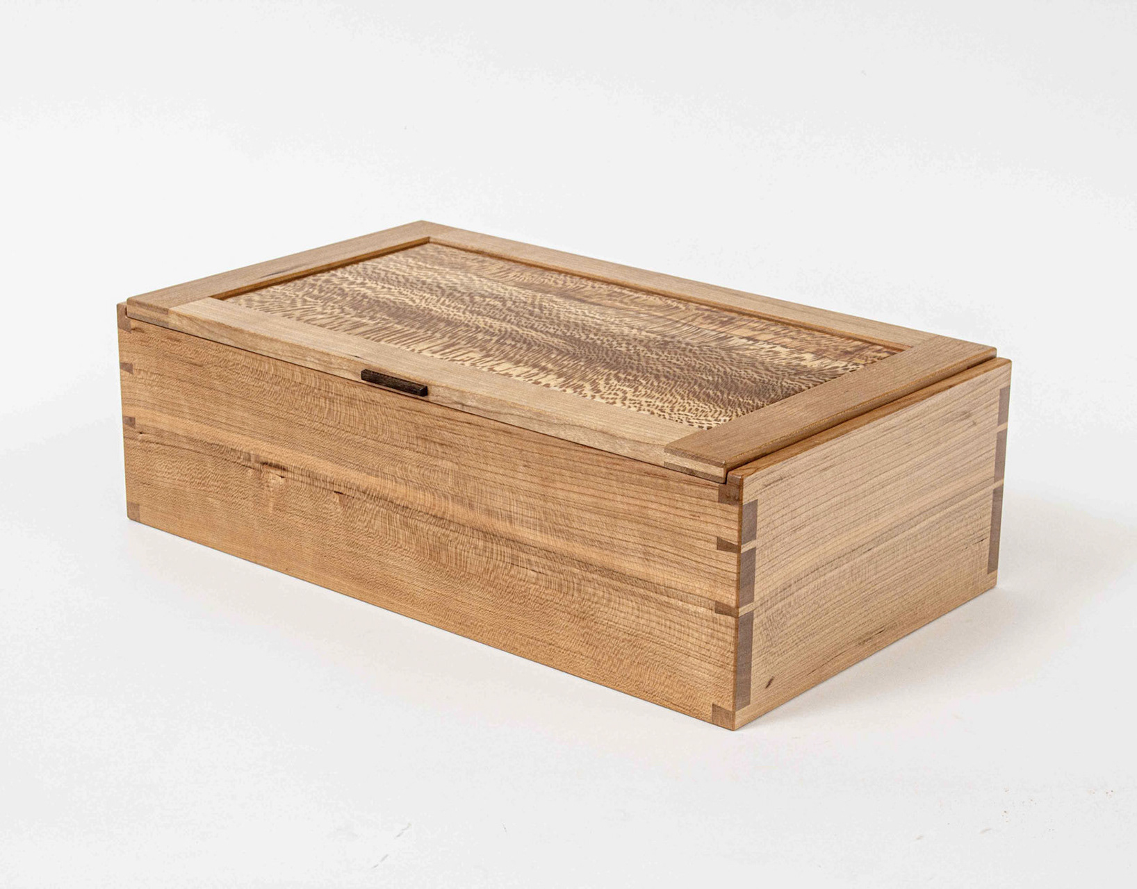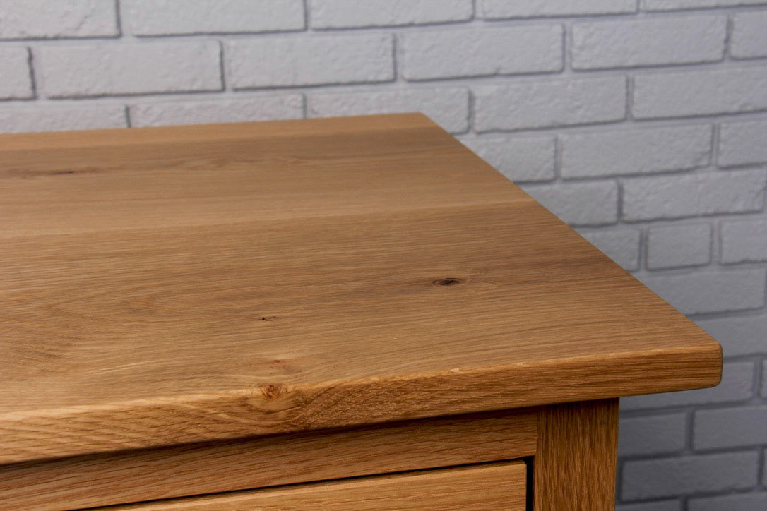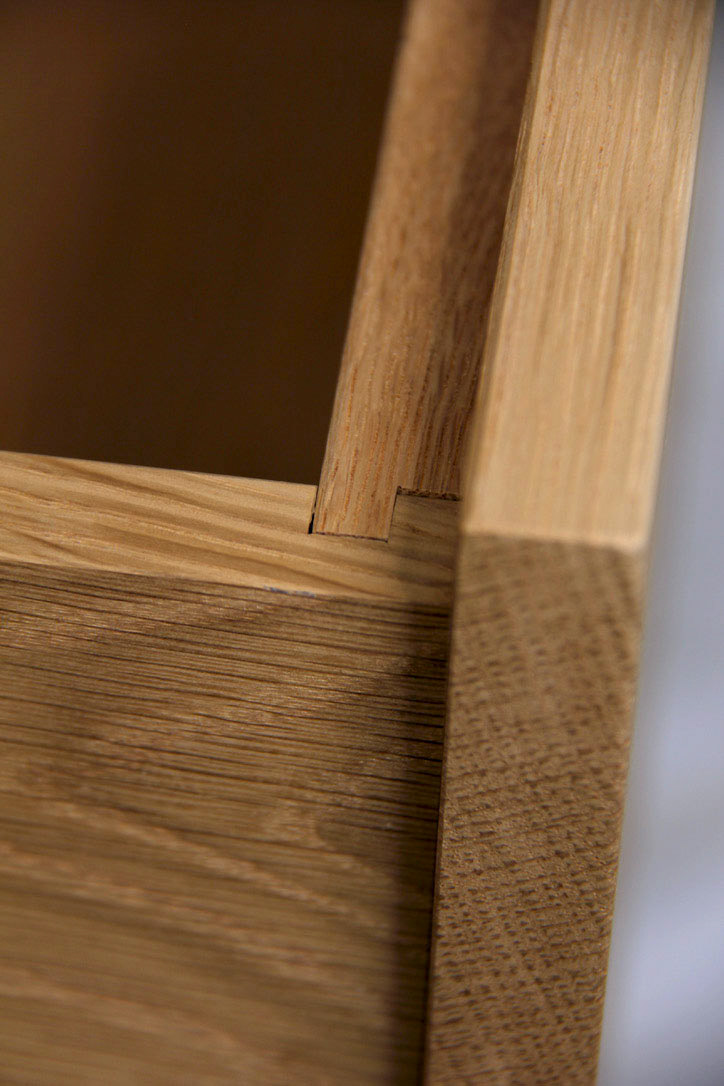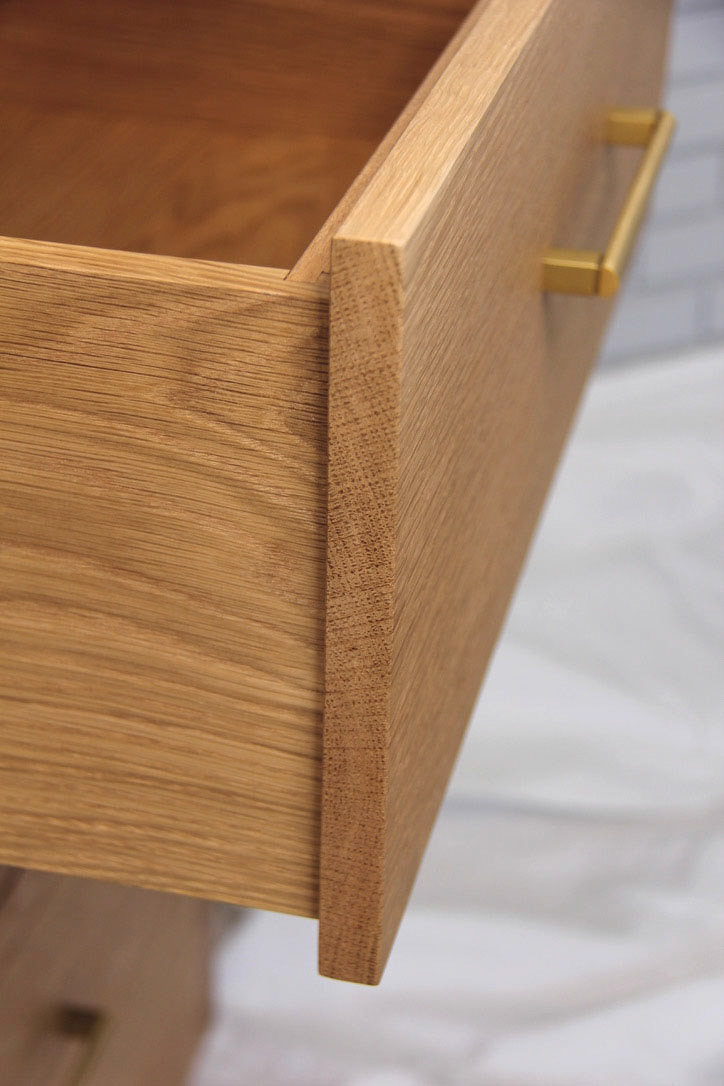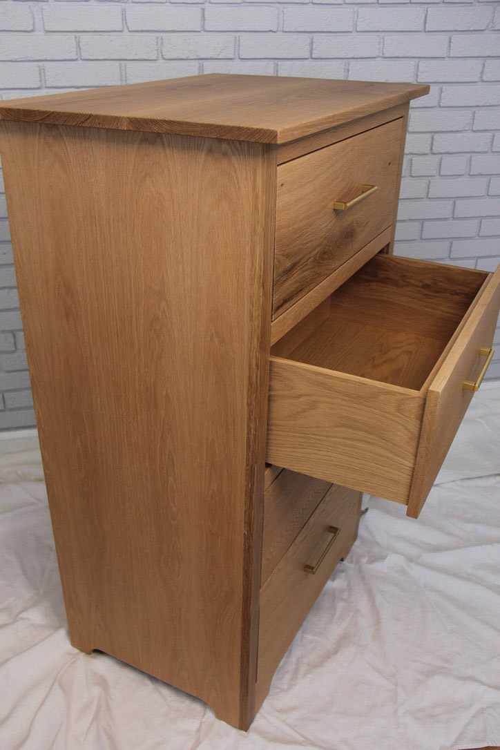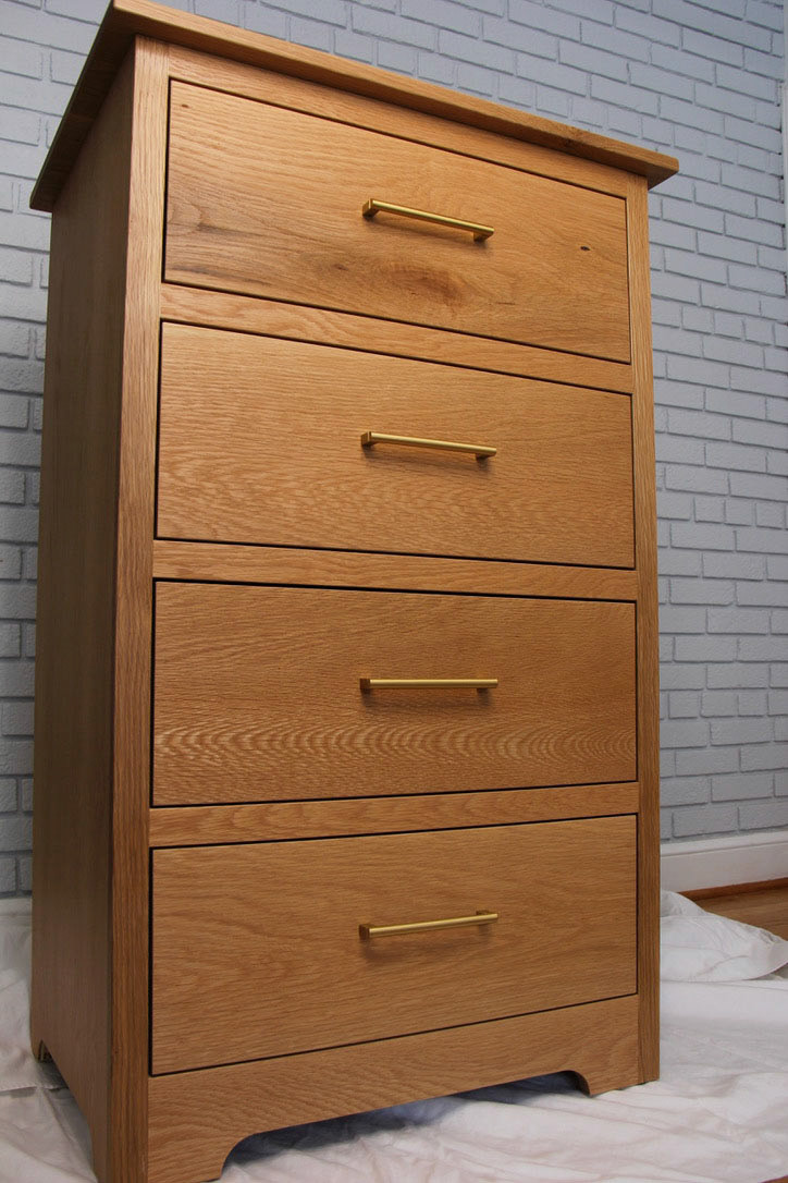 Custom four-drawer dresser in white oak. Features solid wood drawers and brass handles.