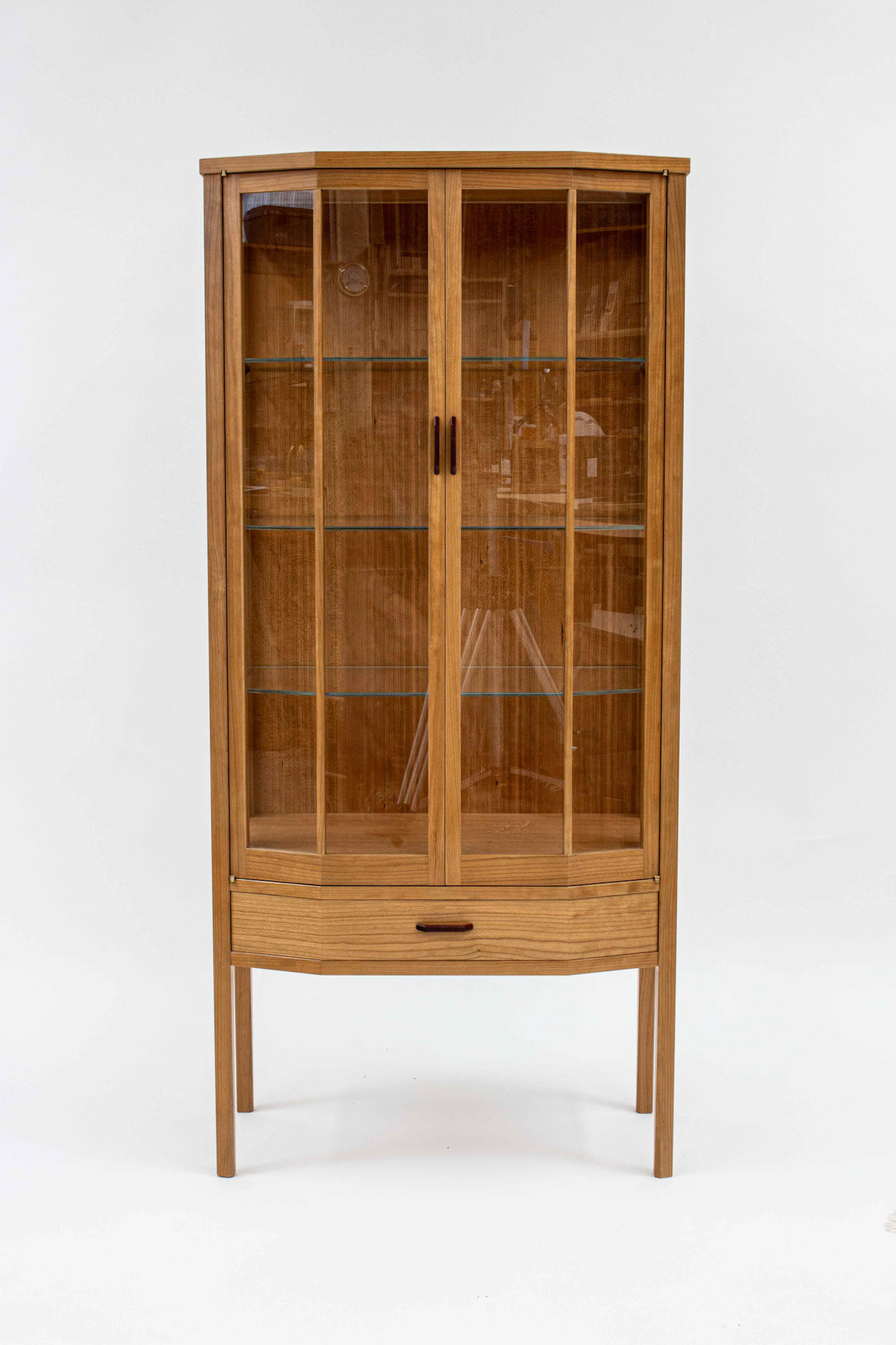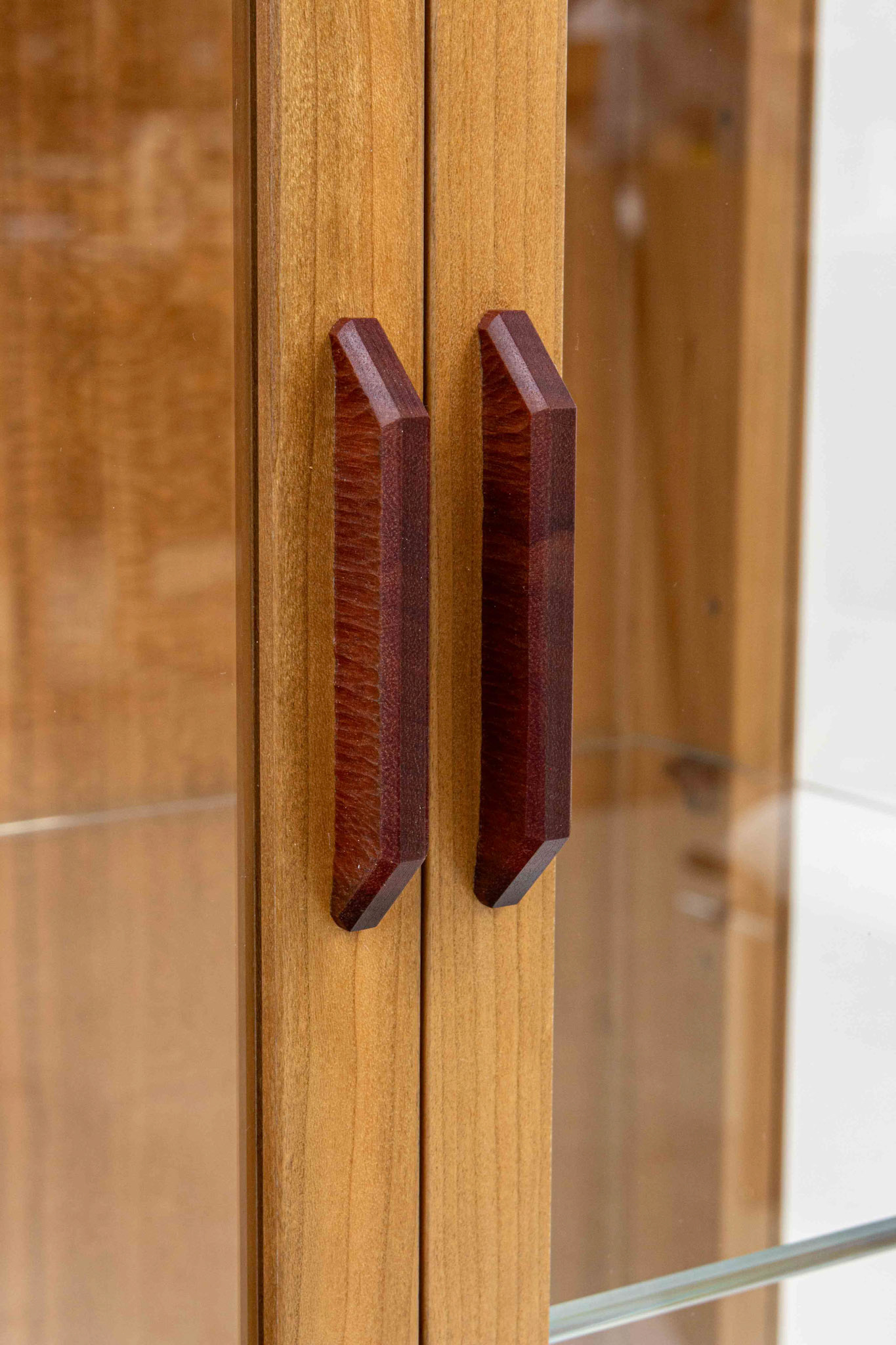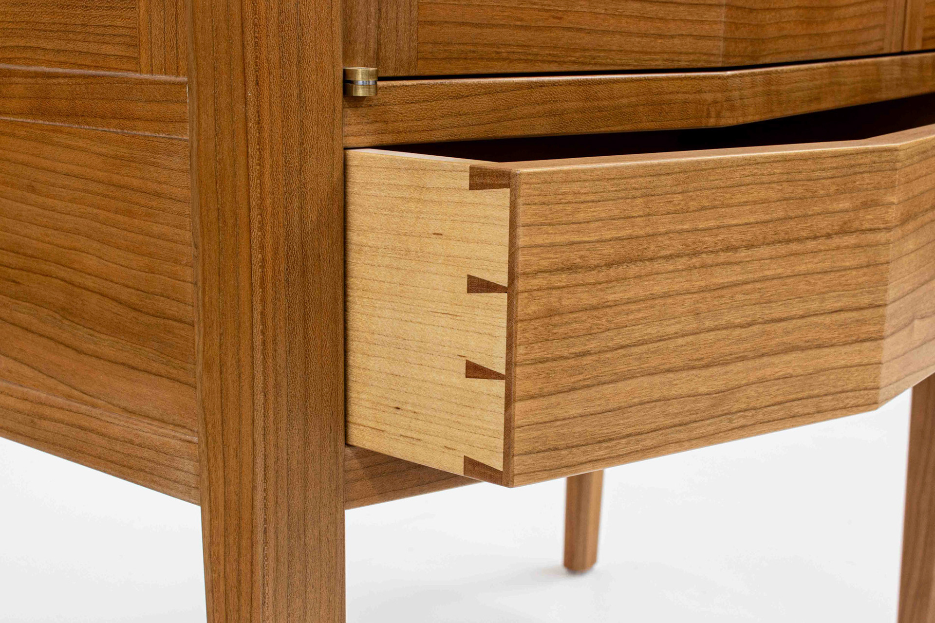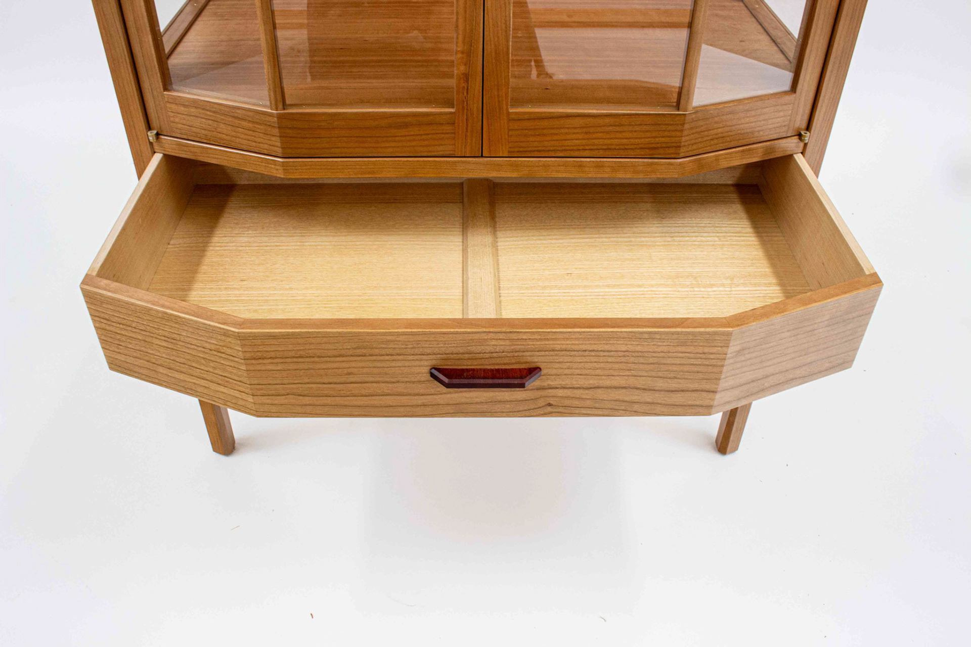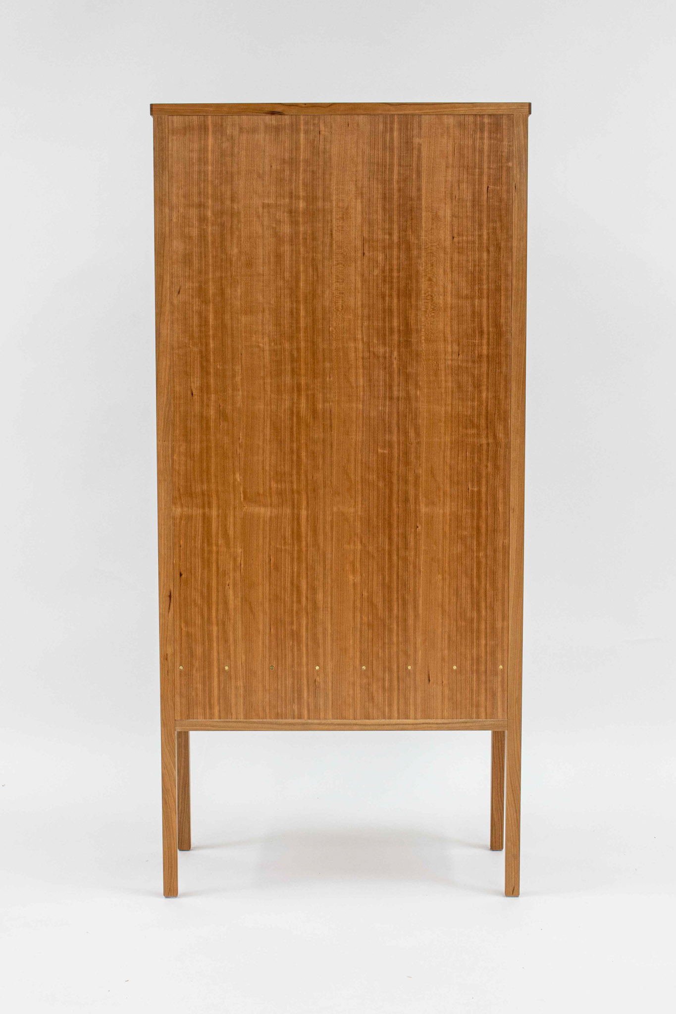 Second Project at the Krenov School. The cabinet was built to hold china and a set of silverware in the lower drawer. The main focal points are the two Krenov-style V-doors, the drawer, and the figured quartersawn Cherry veneers. All veneers are shop-sawn and 1/16" thick. Hand-carved pulls in Jatoba.