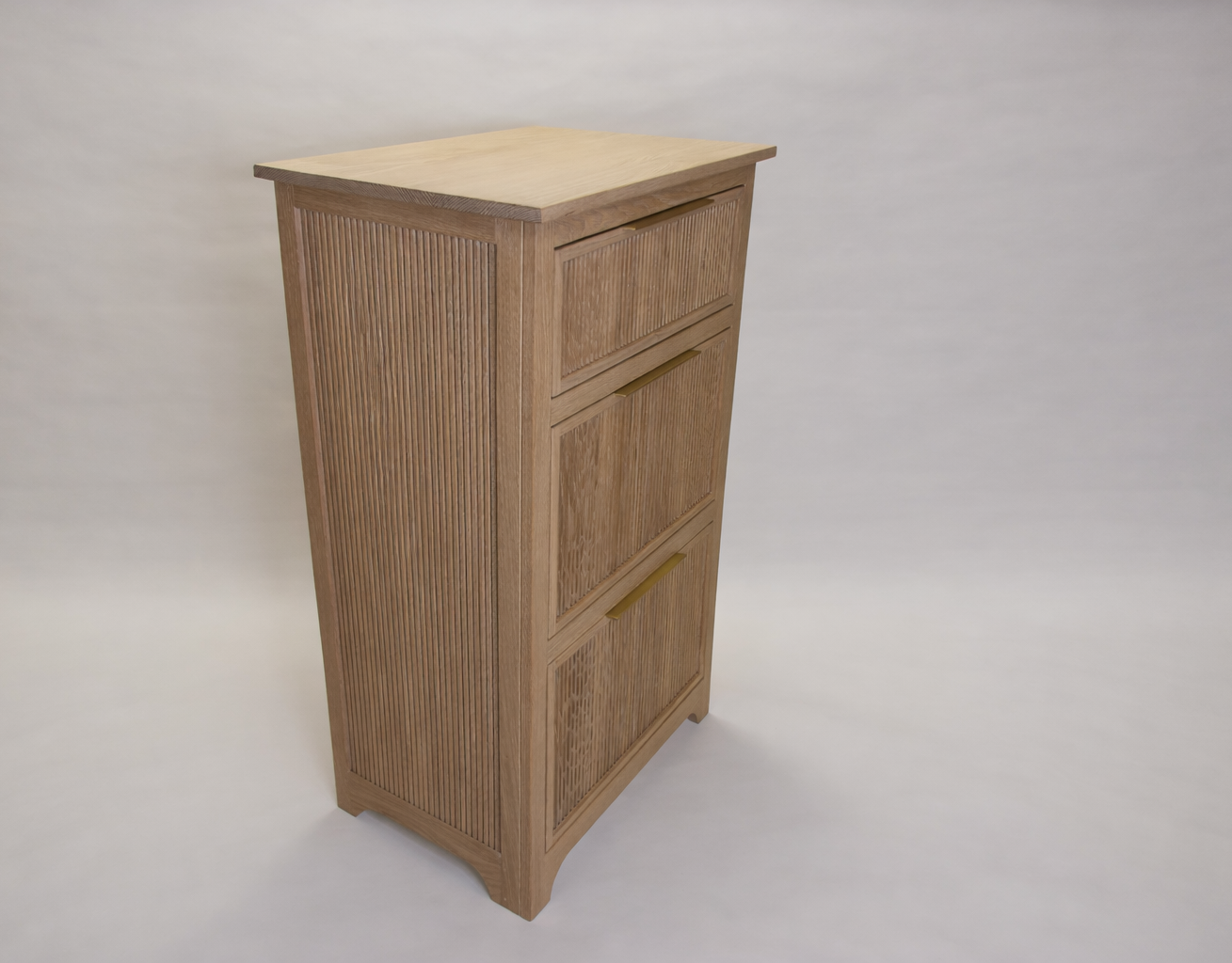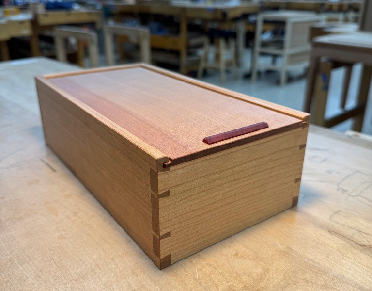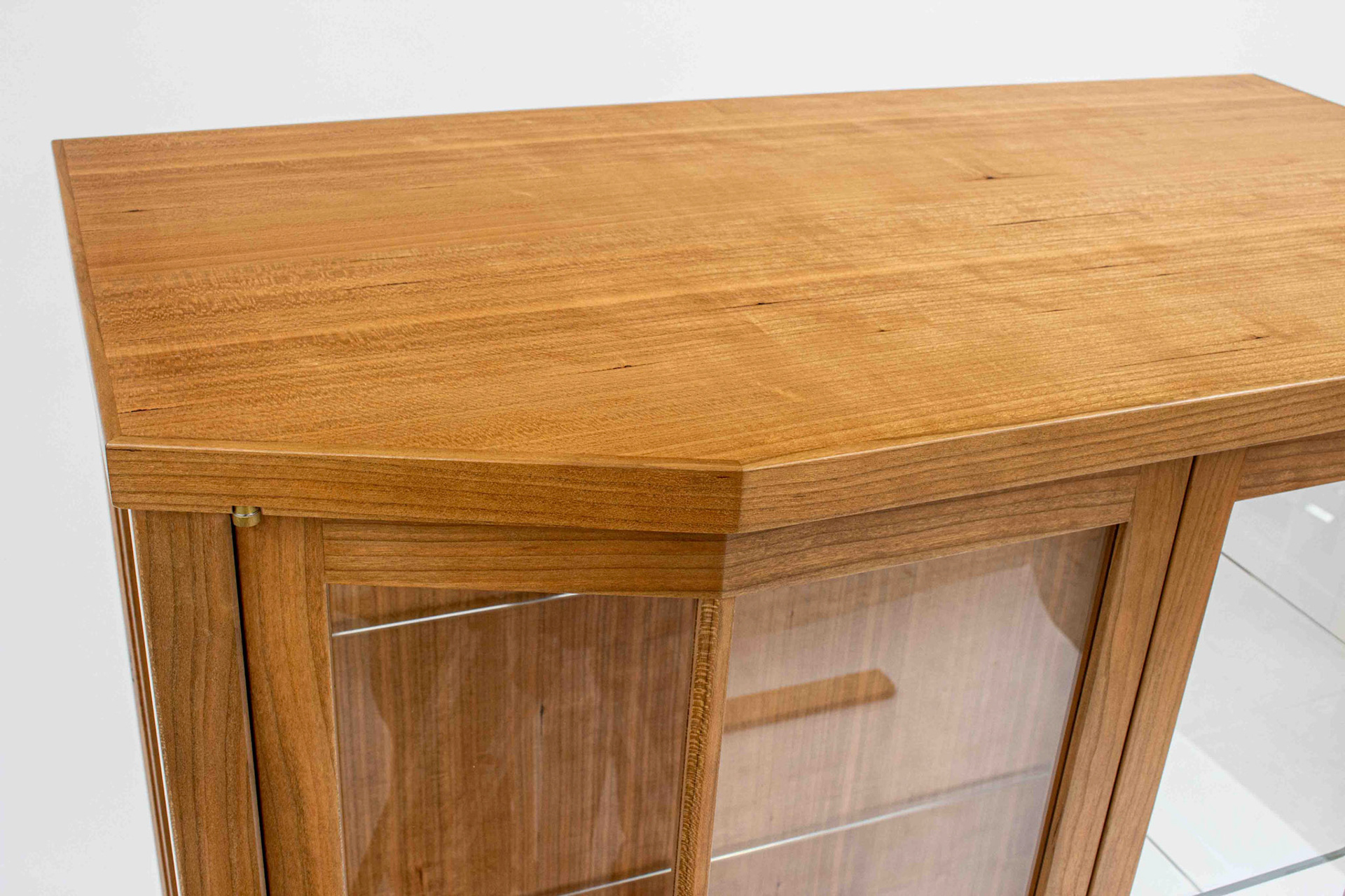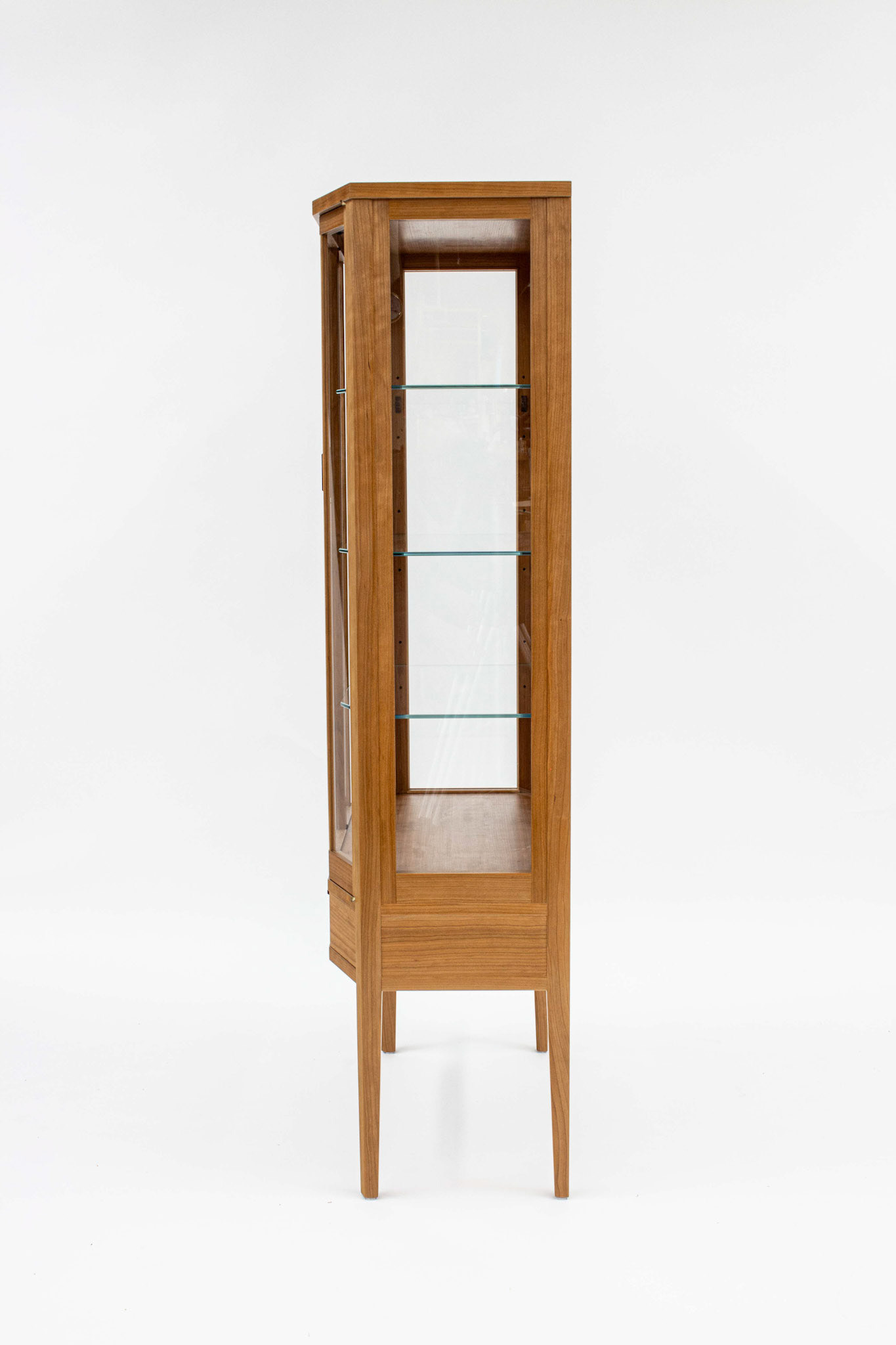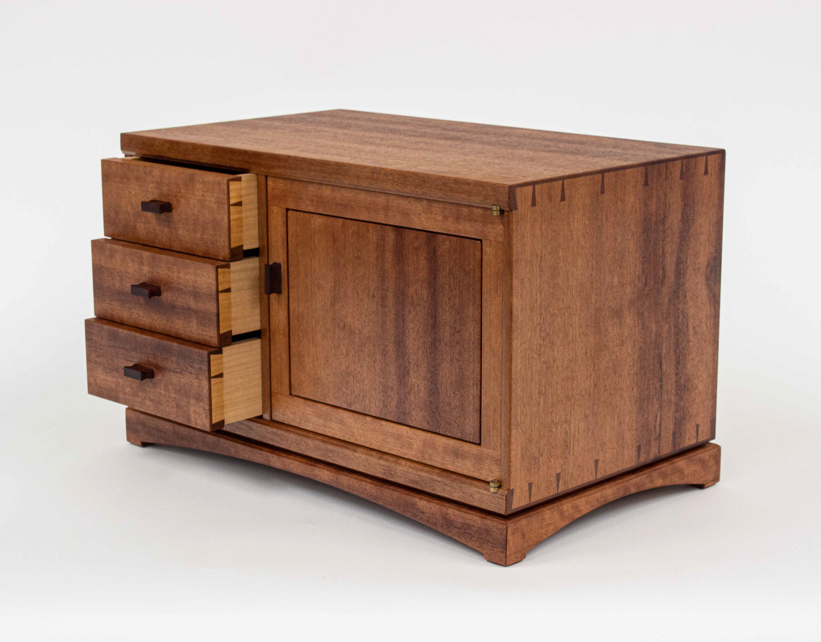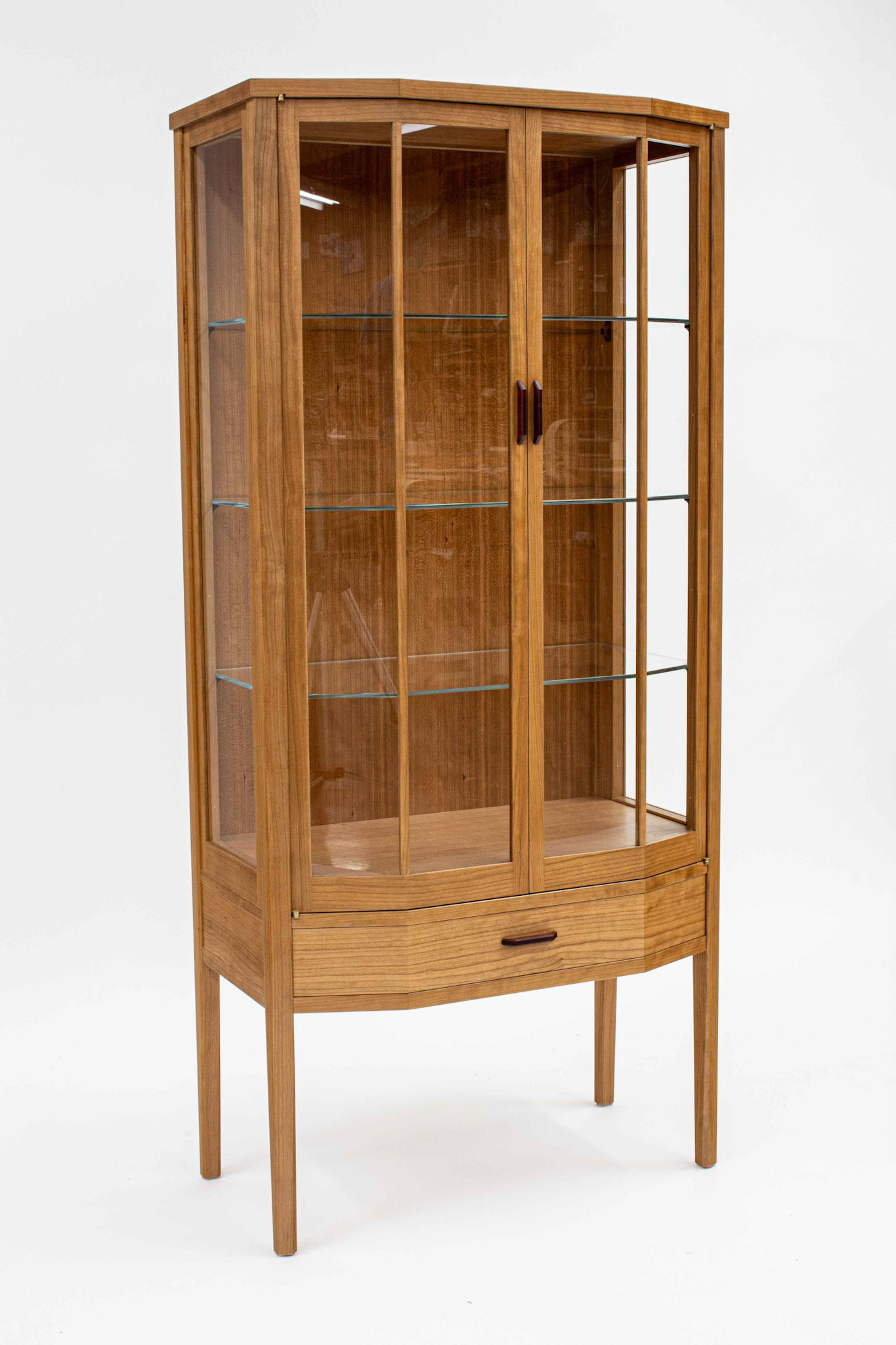 Second Project at the Krenov School. The cabinet was built to hold china and a set of silverware in the lower drawer. The main focal points are the two Krenov-style V-doors, the drawer, and the figured quartersawn Cherry veneers. All veneers are shop-sawn and 1/16" thick. Hand-carved pulls in Jatoba.