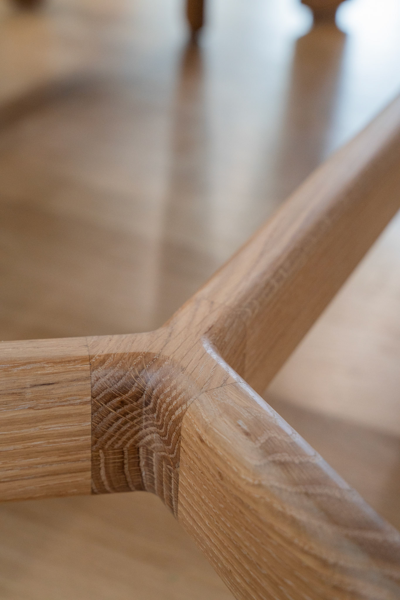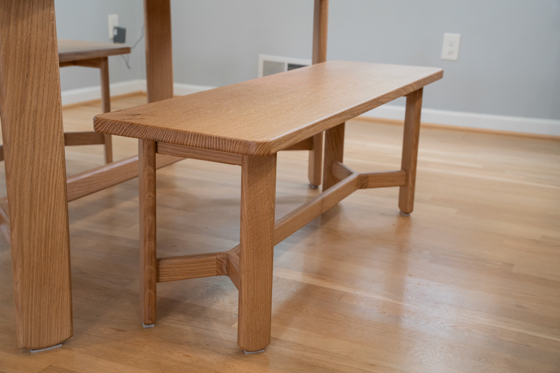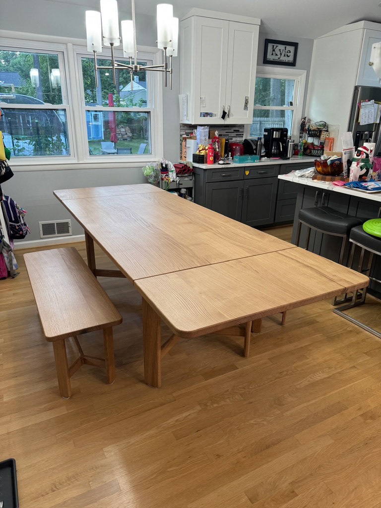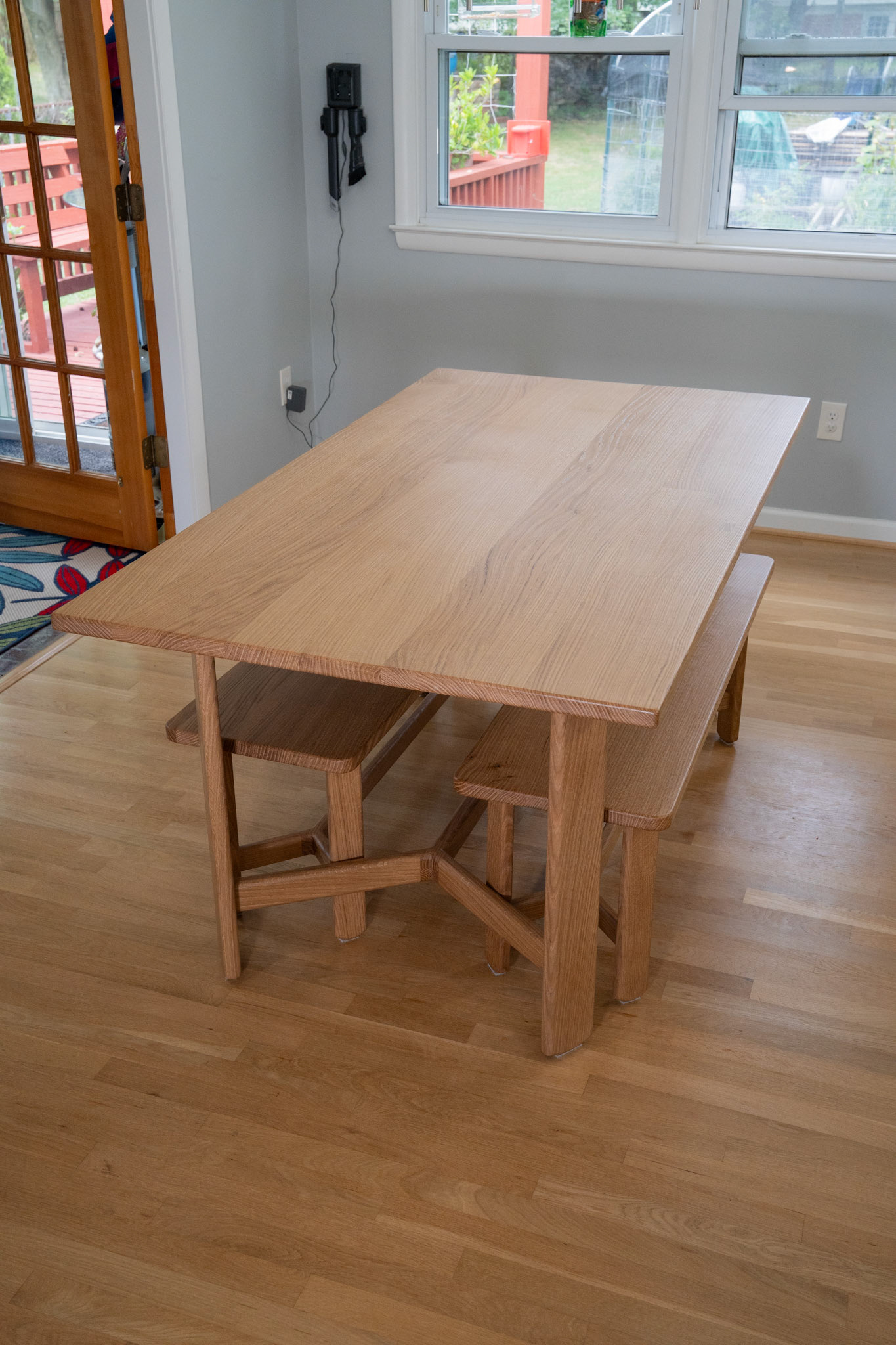 Custom dining table and matching bench set. Continuous grain extension leaves and heavy-duty arms extend the table to a total length of 104."